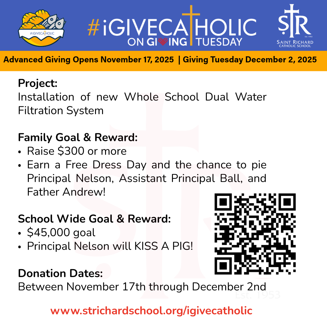 Family Goal Met: Pie Principal Nelson, Assistant Principal Ball, and Fr. Andrew & a free dress day