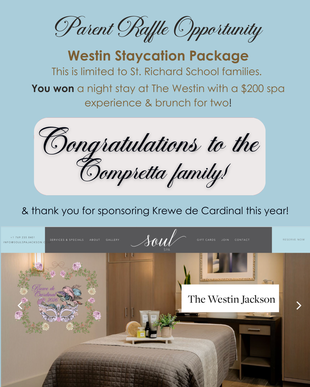 Congratulations, Comprettas! Congratulations Comprettas! Caroline and Jonathan Compretta won the 2026 Westin Staycation Raffle! Thank you to the Compretta family, and all St. Richard School families, who helped to sponsor Krewe de Cardinal 2026! Show Transcript we're picking the raffle for the Western Hotel the cool sponsorship family Print
