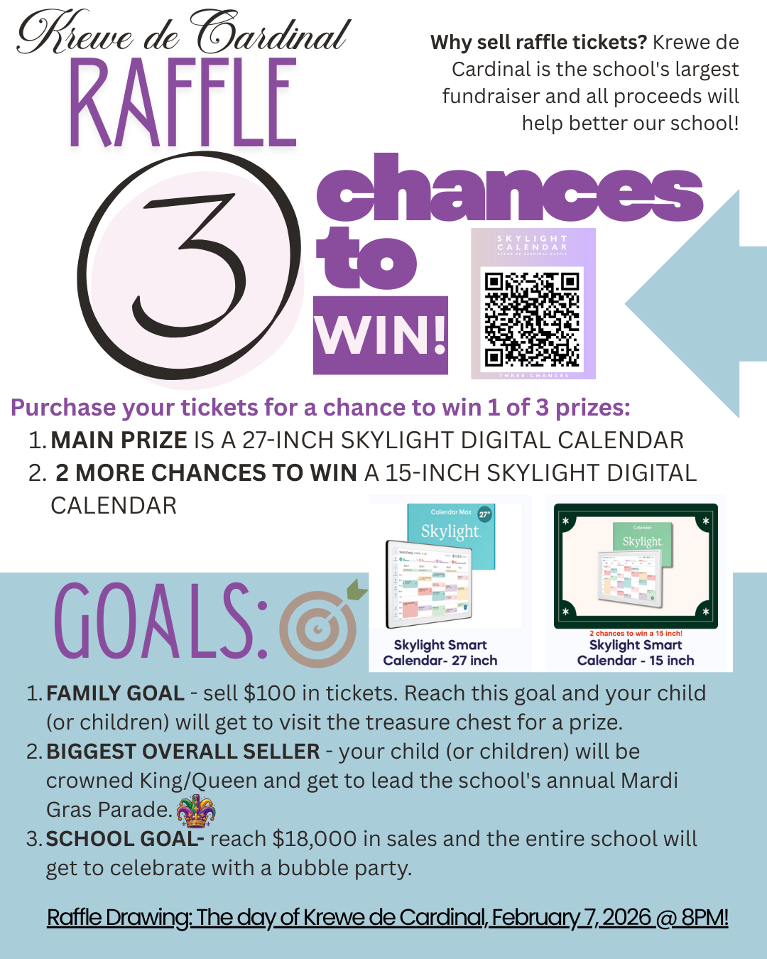 Please continue working toward your family goal of $100 in raffle ticket sales. The winner of this raffle will be announced the night of Krewe de Cardinal (You do not have to be present to win.).