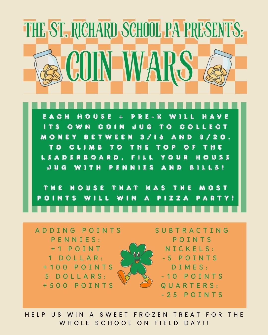 The St. Richard School PA will roll out their annual Coin Wars the week after spring break. All proceeds go towards the funding of a fun dessert on Field Day (last year we had dippin' dots). The House that collects the most coins wins a pizza party! See the flyer for more details.