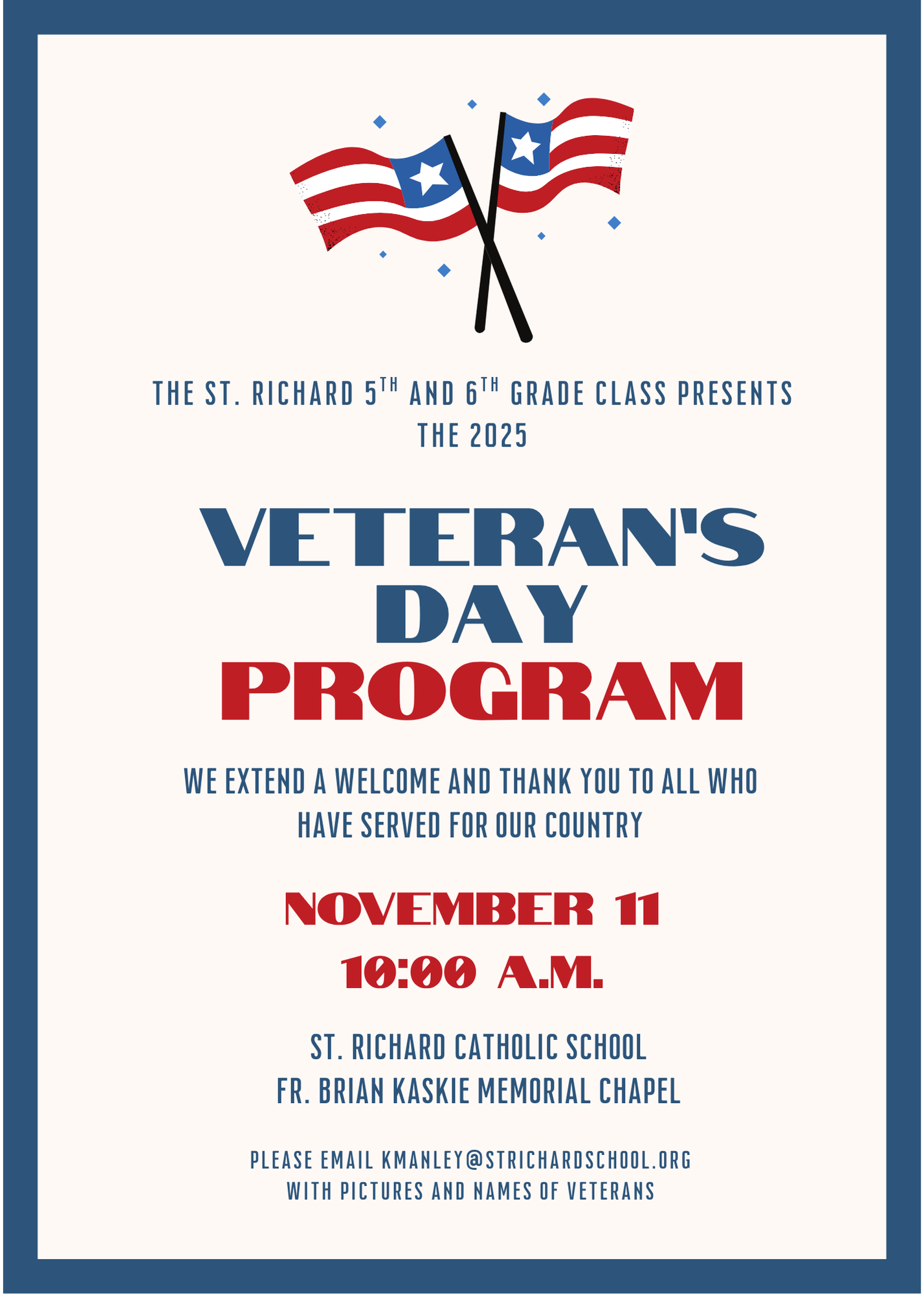 In addition, our 5th & 6th graders will present their Veteran's Day Program on November 11th. Please extend this invitation to family and friends. In addition, if you would like a veteran to be honored during the program, please email